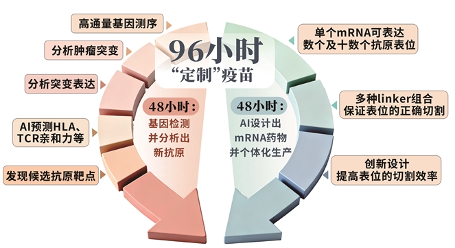 “我们的生产周期加入了AI模式,未来只需要96个小时就能生产个体化的肿瘤疫苗。”范伦祥说,96小时分为两个阶段——48小时用于基因检测并分析出新抗原、48小时用于AI设计出mRNA药物并个体化生产。