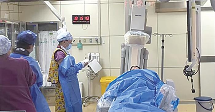 情况紧急,胸痛中心迅速响应,与家属沟通并签署知情同意书,同步办理住院手续,全程开通绿色通道,用最快的速度把吕女士送入导管室接受急诊PCI治疗(经皮冠状动脉介入治疗)。在王宁夫主任医师指导下,徐鹏和钱宇峰副主任医师为她进行介入治疗,术中发现她的右侧冠状动脉近段完全闭塞,通过球囊扩张并植入支架,成功开通了堵塞的血管,恢复了心肌供血。