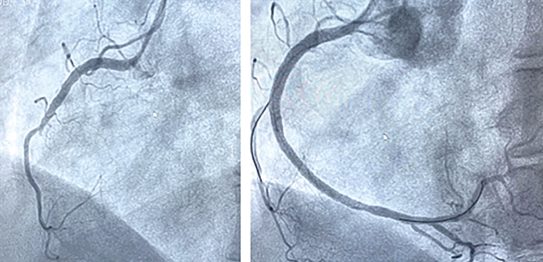 左图术前右冠中段完全闭塞,右图术后右冠完全开通。