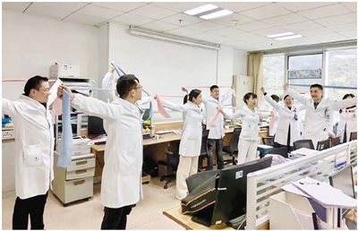 医护人员利用休息时间在办公区健身