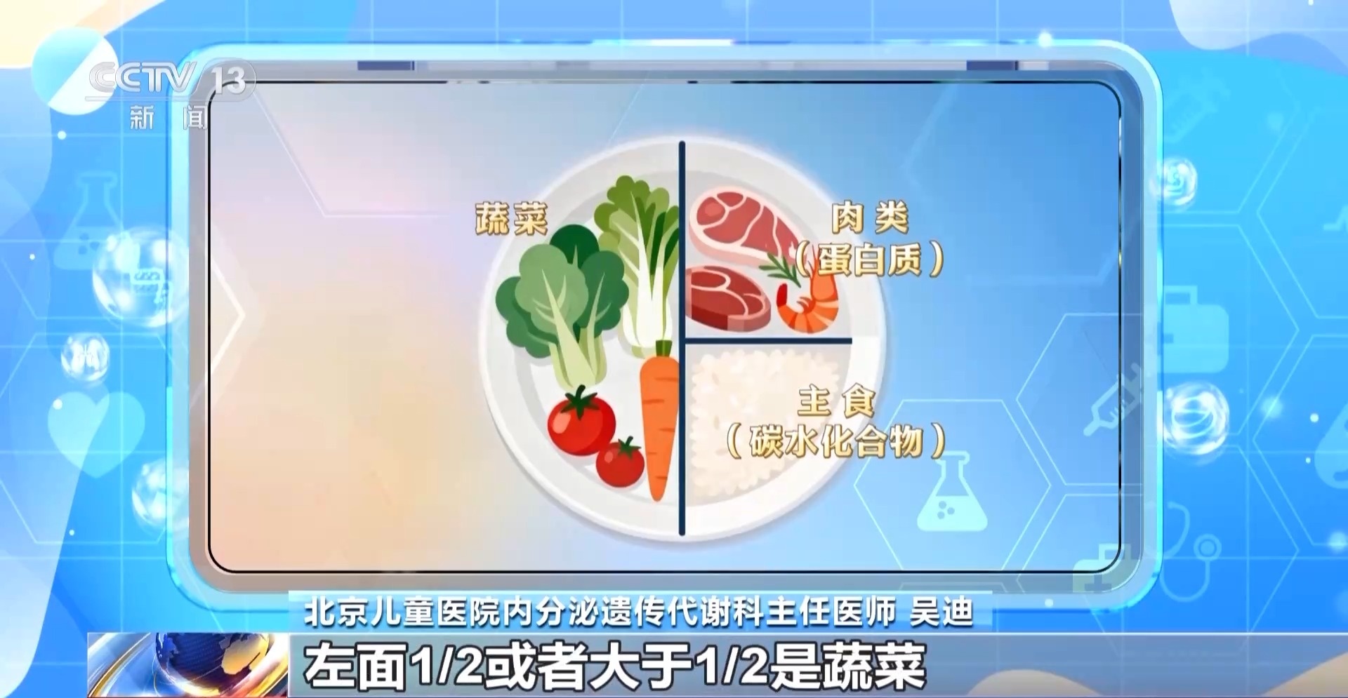 北京儿童医院内分泌遗传代谢科主任医师 吴迪:早上要吃饱,开启一天的生活元气满满,中午要吃好,营养要均衡搭配,晚上要吃得早一些,吃得少一些,睡觉前2到3个小时不建议进食。一般情况下一个圆盘子,可以中间画一条线,左面1/2或者大于1/2是蔬菜,右侧上面1/4是蛋白质,右侧下面1/4是主食。