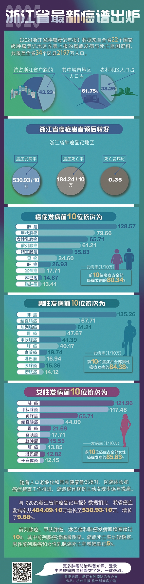 程向东介绍,与《2023浙江省肿瘤登记年报》相比,我省癌症发病率从484.09/10万增长至530.93/10万,增长了9.68%;前列腺癌、甲状腺癌、淋巴瘤和肺癌发病率增幅均超10%,增幅最明显的是前列腺癌;癌症死亡率相对稳定,男性前列腺癌和女性乳腺癌死亡率增幅超5%。