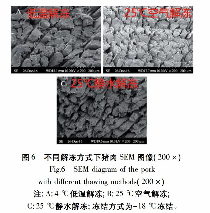 一篇发表在《食品工业科技》上的文献显示,研究人员用实验对比了不同解冻方式对猪肉品质的影响,包括 25℃ 室温解冻、25℃ 静水解冻、4℃ 低温解冻。结果表明 4℃ 低温解冻虽然比较慢,但不仅能降低细菌的繁殖,还能抑制脂肪的氧化。较慢的解冻还可让肉类中的水分有充分的时间渗透迁移到组织之中,尽量维持饱满的状态,能够较好的保持肉类品质。[5]
