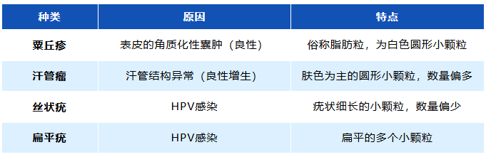 眼周出现的小颗粒主要有四种:粟丘疹、汗管瘤、丝状疣和扁平疣。它们的成因、外观和处理方式各有不同,我们需要根据颗粒的特征来判断是哪一种,以便采用正确的应对方法。下面的表格是对这几种小颗粒的总结。
