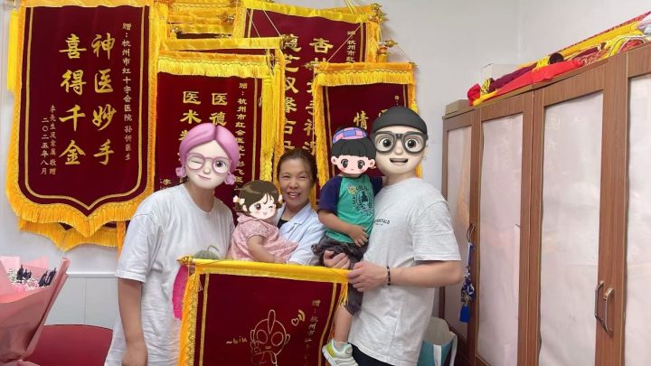 缓缓推开诊室的门,一束阳光正落在桌上那面崭新的锦旗上。锦旗旁,是一束盛放的鲜花和定制的签字笔组成的花束。浙江省中西医结合医院(杭州市红十字会医院)生殖医学科孙忻主任医师望着眼前幸福的一家四口——年轻的父母怀里抱着一个粉雕玉琢的女婴,身边还依偎着一个虎头虎脑的小男孩,她不禁眼眶湿润。