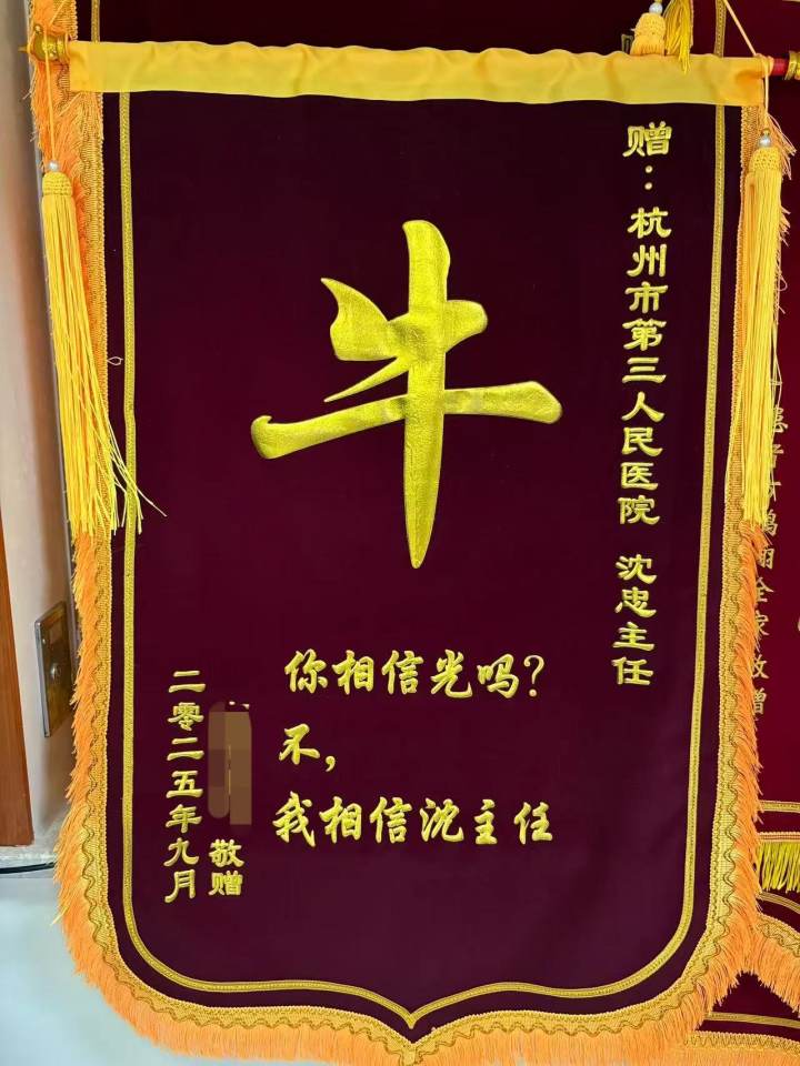 “你相信光吗?不,我相信沈主任。”在杭州市第三医院肛肠外科的医生办公室,满墙锦旗层层叠叠,尤为引人注目的是左侧墙面上的锦旗。其中大部分锦旗都指向同一个名字:沈忠主任。
